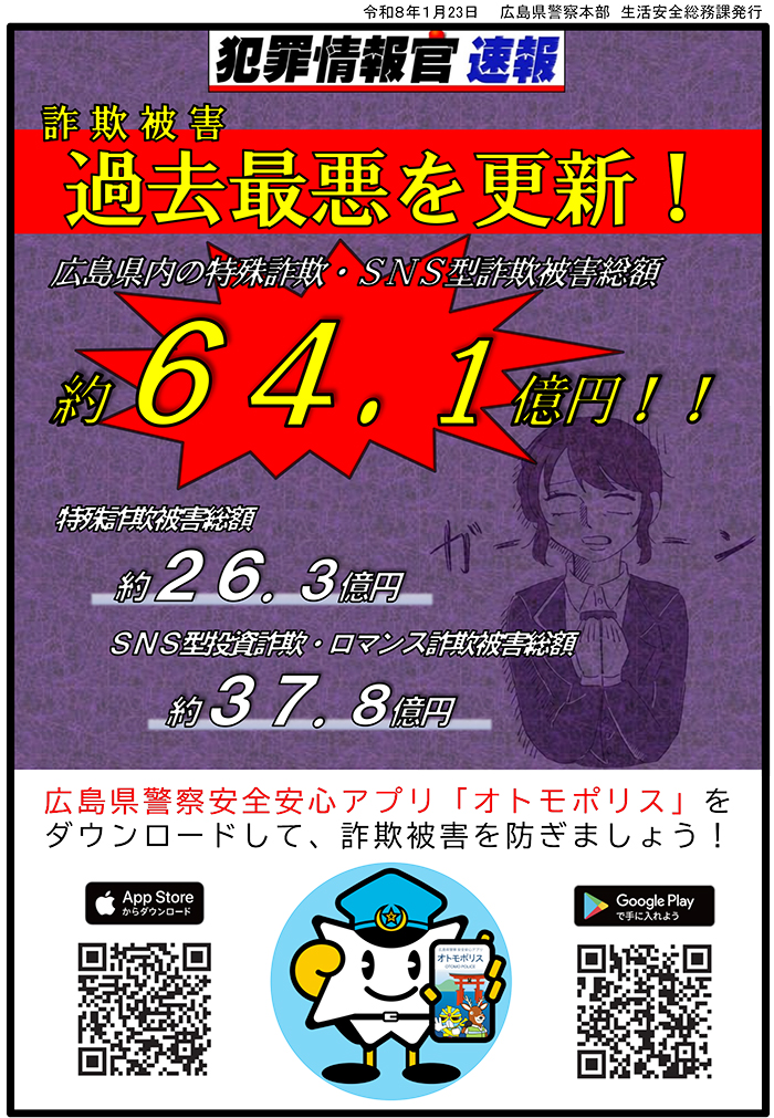 広島県内の特殊詐欺・SNS型詐欺被害総額 約64.1億円!!